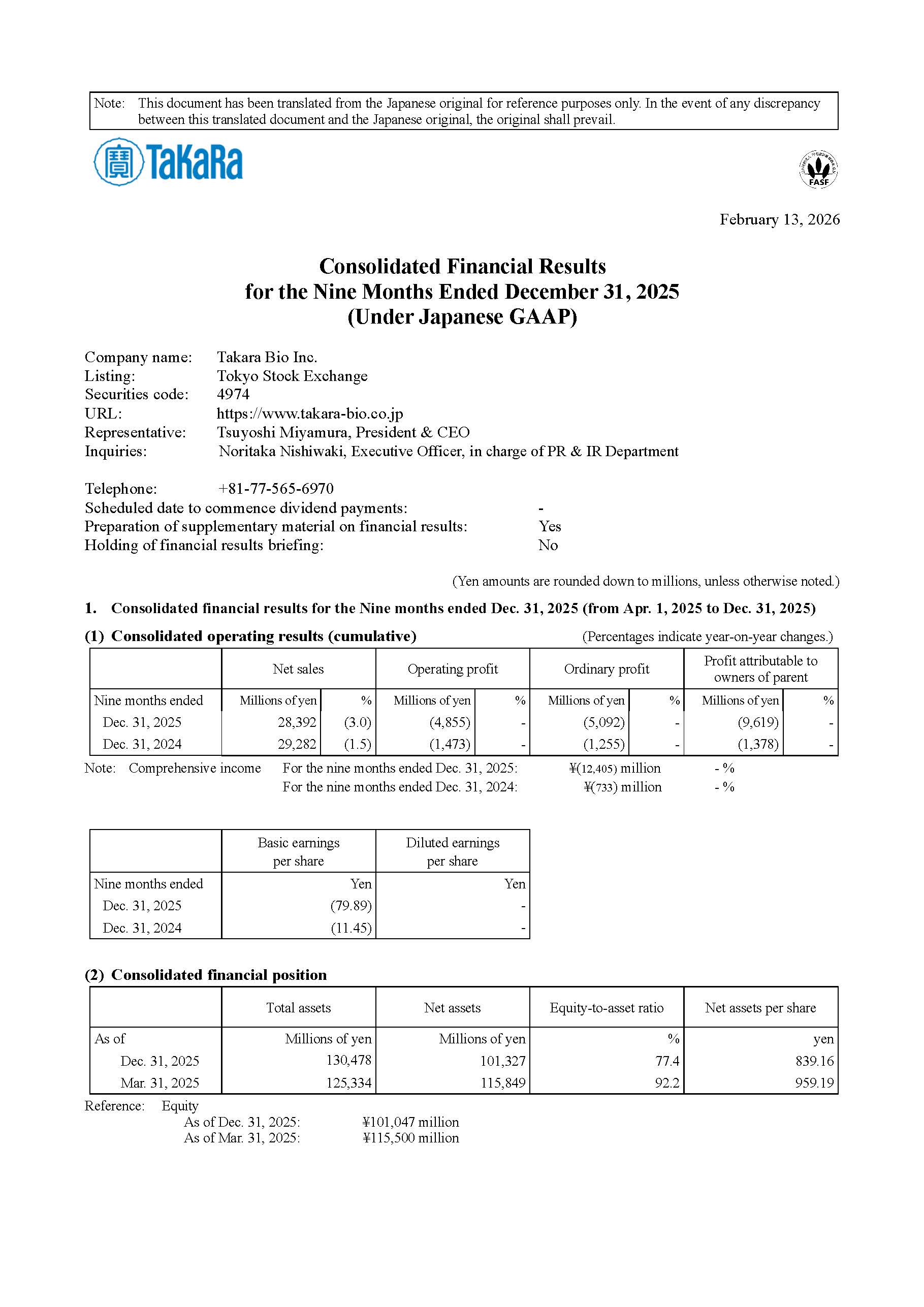 Consolidated Financial Results for the Nine Months Ended December 31, 2025 (Under Japanese GAAP)